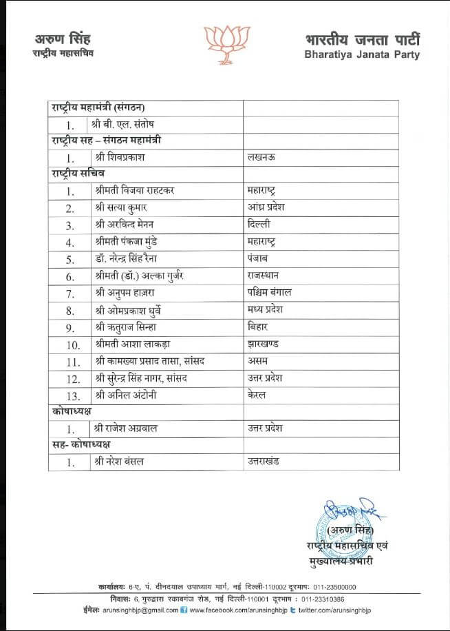 इसके मुताबिक, बीएल संतोष राष्ट्रीय संगठन महामंत्री बने रहेंगे। शिवप्रकाश को राष्ट्रीय सह संगठन महामंत्री की जिम्मेदारी दी गई है। राजेश अग्रवाल को कोषाध्यक्ष और नरेश बंसल को सह कोषाध्यक्ष बनाया गया है।