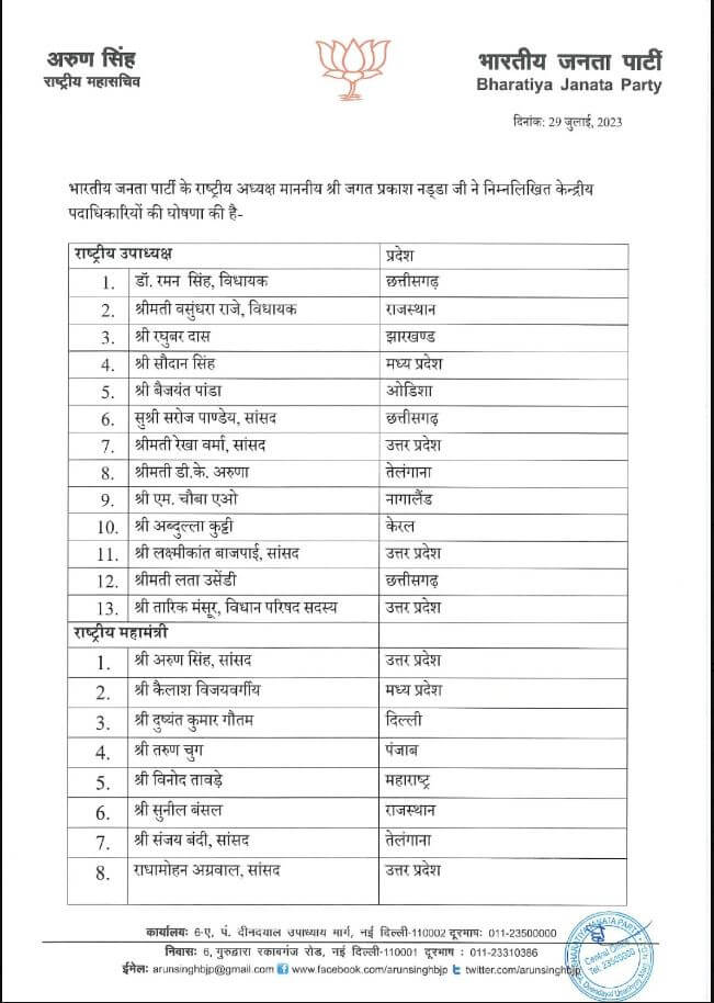 तीन पूर्व मुख्यमंत्रियों डॉ. रमन सिंह, वसुंधरा राजे, रघुबर दास को राष्ट्रीय उपाध्यक्ष बनाया गया है। मध्यप्रदेश से सौदान सिंह को राष्ट्रीय उपाध्यक्ष और कैलाश विजयवर्गीय को राष्ट्रीय महामंत्री का पद दिया गया है। कांग्रेस से आए अनिल एंटनी को राष्ट्रीय सचिव बनाया गया है। अनिल कांग्रेस नेता एके एंटनी के बेटे हैं।