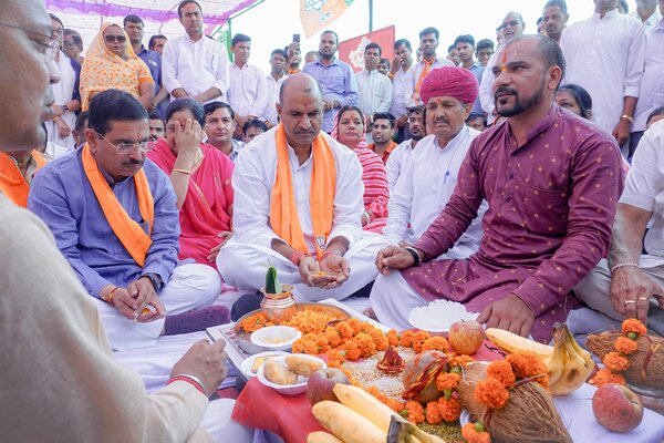 जयपुर:-प्रधानमंत्री नरेन्द्र मोदी के आगामी 25 सितंबर जयपुर में भाजपा की परिवर्तन यात्रा के समापन मौके पर आयोजित होने वाली दादिया पंचायत सूरजपुरा (वाटिका) में शनिवार को संसदीय कार्य मंत्री प्रहलाद जोशी, भाजपा प्रदेश अध्यक्ष सीपी जोशी सहित विभिन्न नेता जनसभा के लिए बनने पांडाल का भूमि पूजन करते हुए।