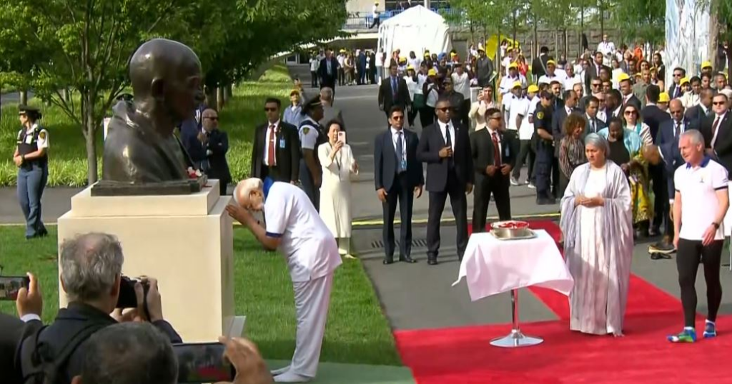 New York [US], June 21 (ANI): Prime Minister Narendra Modi on Wednesday arrived at the UN Headquarters lawns in New York to lead the Yoga event on the occasion of the ninth International Day of Yoga. The prime minister upon his arrival, paid tribute to Mahatma Gandhi at the UN Headquarters’ lawns.