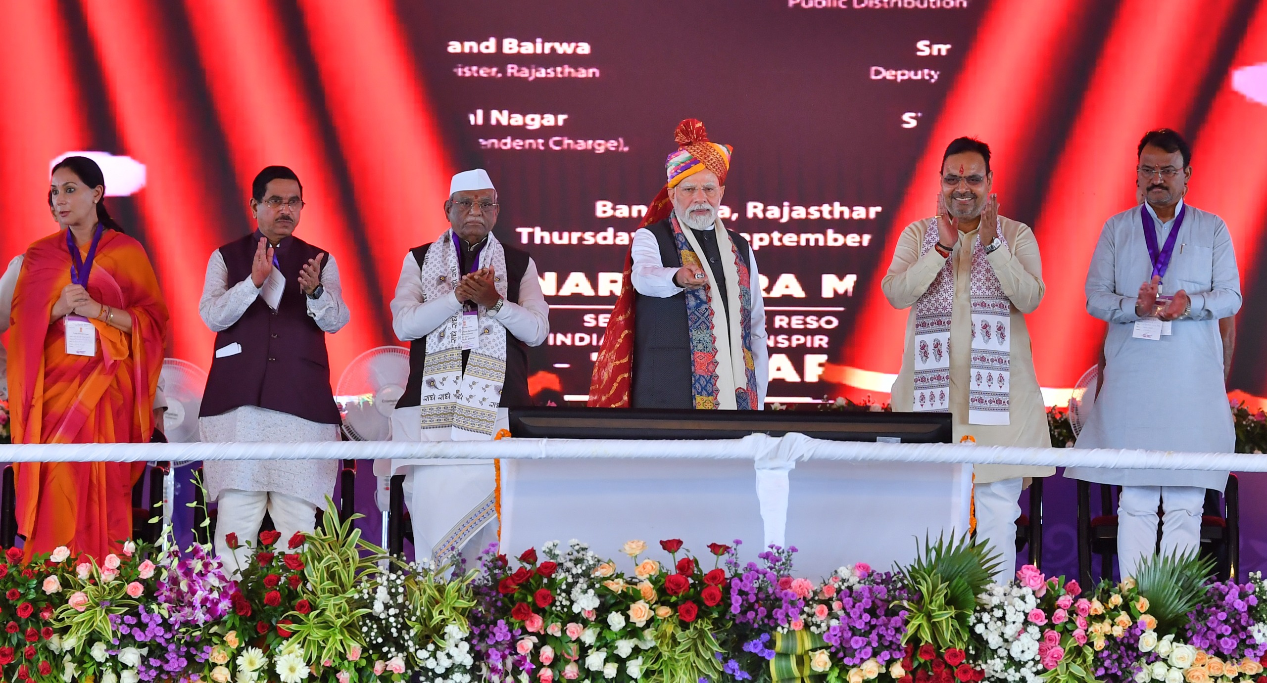 कार्यक्रम की शुरूआत में प्रधानमंत्री नरेन्द्र मोदी ने इस अवसर पर स्व. पंडित दीनदयाल उपाध्याय के चित्र पर श्रद्धांजलि अर्पित की। मुख्यमंत्री ने प्रधानमंत्री मोदी का साफा पहनाकर और आदिवासी सम्मान का प्रतीक तीर-कमान भेंट कर स्वागत किया।