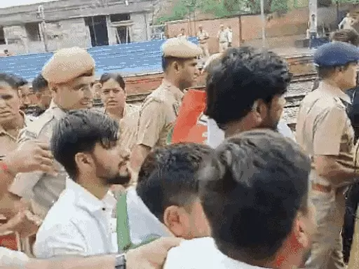 जयपुर में प्रदर्शन के कारण गांधी नगर रेलवे स्टेशन के बाहर और अंदर पुलिस का भारी जाब्ता तैनात था। यूथ कांग्रेस के नेता सुबह 10.48 बजे गांधी नगर रेलवे स्टेशन के प्लेटफॉर्म 1 पर पहुंचे। पुलिस ने सभी को प्लेटफॉर्म पर ही रोक दिया। इसके बाद सभी वही धरने पर बैठ गए। इस दौरान अभिमन्यु पूनिया और पुलिस के बीच बहस हो गई।