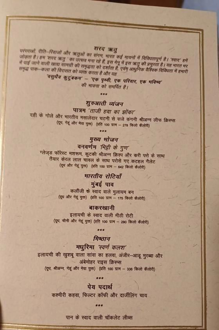 नई दिल्ली:-G20 समिट के लिए भारत आए विदेशी मेहमानों के सम्मान में राष्ट्रपति द्रौपदी मुर्मू डिनर होस्ट कर रही हैं। मेन्यू में सभी वेजिटेरियन यानी शाकाहारी डिश शामिल की गई हैं। मेन्यू पर भी प्रेसिडेंट ऑफ इंडिया की जगह प्रेसिडेंट ऑफ भारत लिखा है। मेन्यू को भारत की परंपरा, रीति-रिवाज और विविधता को ध्यान में रखकर तैयार किया गया है।