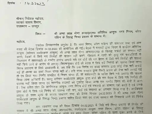 इसमें अंबा लाल मीणा पर कार्रवाई करने और नगर निगम से हटाए जाने की अनुशंसा की गई है। कोटा दक्षिण महापौर राजीव अग्रवाल ने यह पत्र डीएलबी को भेजा है। 4 फरवरी को कोटा नगर निगम दक्षिण की बोर्ड बजट बैठक का आयोजन किया गया। इसमें पक्ष और विपक्ष के सभी पार्षदों ने एक ही सुर में नगर निगम के अधिकारियों पर उनके काम नहीं करने और बोर्ड बैठक में हुए निर्णय की पालना नहीं करने के आरोप लगाए थे।