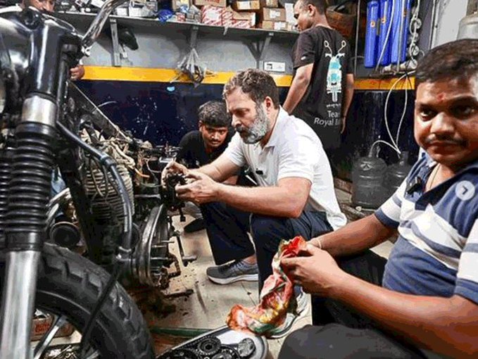 एक फोटो में राहुल के हाथ में टू व्हीलर का कोई पार्ट दिखाई दे रहा है। उनके सामने एक बाइक खुली हुई है। साथ में कुछ लोग बैठे दिखाई दे रहे हैं। वहीं एक अन्य फोटो में राहुल एक बाइक में स्क्रू ड्राइवर से पेच कसते दिखाई दे रहे हैं। वहीं एक फोटो में वे गैरेज कर्मी से मशीन की जानकारी ले रहे हैं।