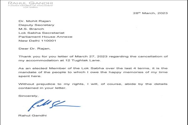 राहुलगांधी ने पत्र में लिखा कि ने प्रिय मिस्टर राजन, 12, तुगलक रोड स्थित मुझे मिले सरकारी बंगले में मेरे ठहरने के समय के खत्म होने के बारे में 27 मार्च को आपके भेजे गए पत्र के लिए धन्यवाद। पिछले 4 कार्यकालों में लोकसभा के एक निर्वाचित सदस्य के रूप में, जो लोगों का जनादेश है, जिसके लिए मैं यहां बिताए अपने समय की सुखद यादों का आभारी हूं।