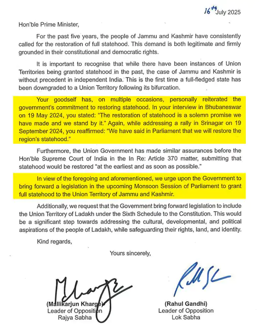 राहुल गांधी ने अपने पत्र में प्रधानमंत्री के पिछले दो बयानों का हवाला भी दिया—पहला 19 मई 2024 को भुवनेश्वर की एक रैली में और दूसरा 19 सितंबर 2024 को श्रीनगर में दिए गए बयान में, जिसमें पीएम मोदी ने जम्मू-कश्मीर को दोबारा राज्य का दर्जा देने का वादा किया था।