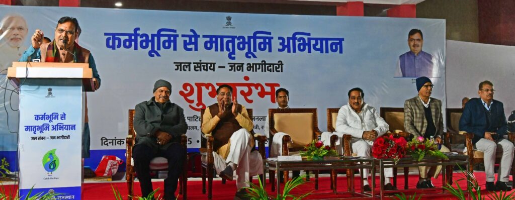 कार्यक्रम में मुख्यमंत्री भजनलाल शर्मा ने कहा कि जल संचय के कार्यों के शुभारंभ के लिए बारिश आने से बेहतर और कोई शुभ संकेत नहीं हो सकता। उन्होंने कहा कि जल संसाधनों की सीमितता को देखते हुए वर्षा जल को व्यर्थ बहने से रोकना और संरक्षित करना आवश्यक है। इसी दिशा में ‘कर्मभूमि से मातृभूमि अभियान’ संचालित किया जा रहा है, जन सहभागिता से जल संचयन के कार्यों को सशक्त बनाने के इस अभियान में प्रवासी राजस्थानियों का भी अहम सहयोग प्राप्त हो रहा है।