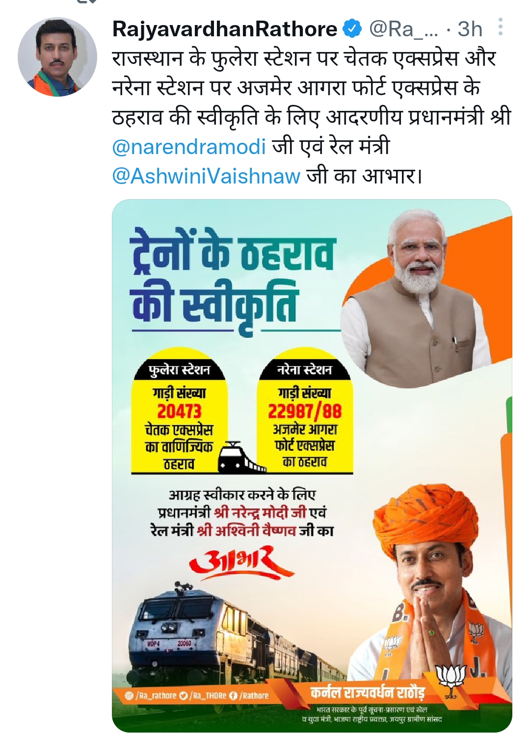 पूर्व केंद्रीय मंत्री एवं जयपुर ग्रामीण सांसद राज्यवर्धन सिंह राठौड़ में आज टि्वटर पर प्रधानमंत्री नरेंद्र मोदी व रेल मंत्री अश्वनी वैष्णव का फुलेरा में चेतक एक्सप्रेस गाड़ी संख्या20473 व नरेना रेलवे स्टेशन पर अजमेर आगरा फोर्ट एक्सप्रेस ट्रेन नंबर 22987/88 के वाणिज्यिक ठहराव की स्वीकृति देने पर आभार जताया । सांसद ने बताया लंबे समय से क्षेत्र की जनता उक्त ट्रेनों के ठहराव की मांग कर रही थी । माननीय प्रधानमंत्री व रेल मंत्री अश्वनी वैष्णव ने मेरी प्रार्थना पर ट्रेनों के ठहराव की स्वीकृति दी।