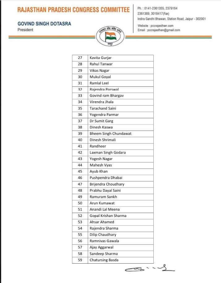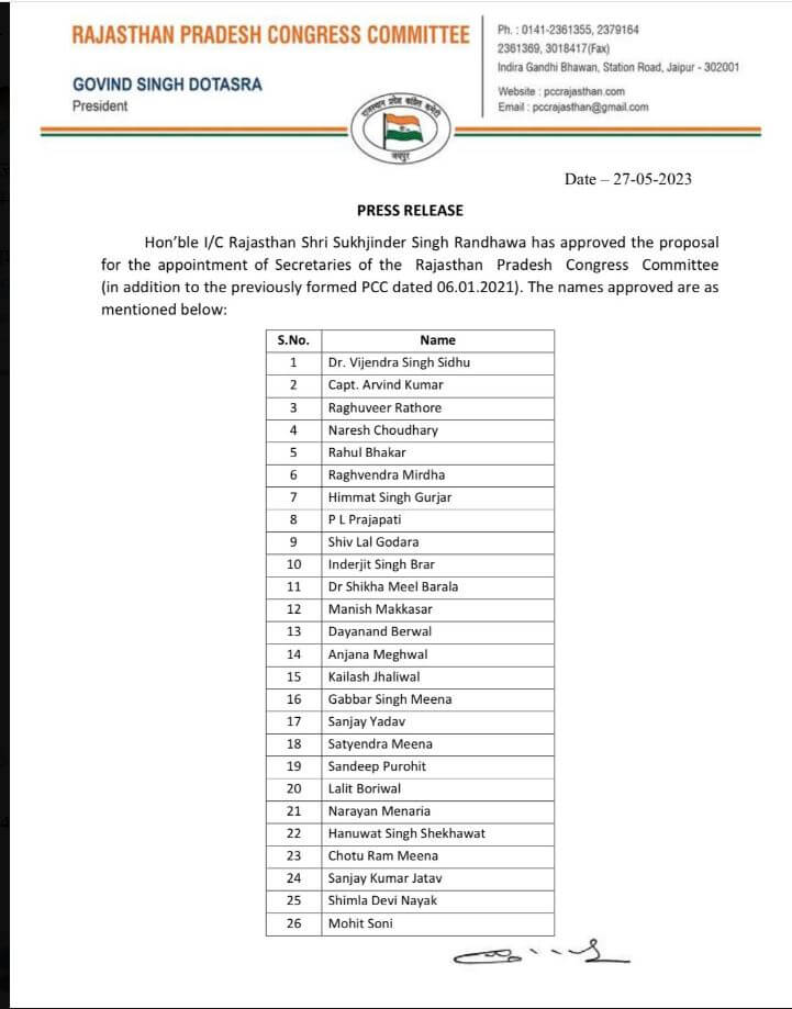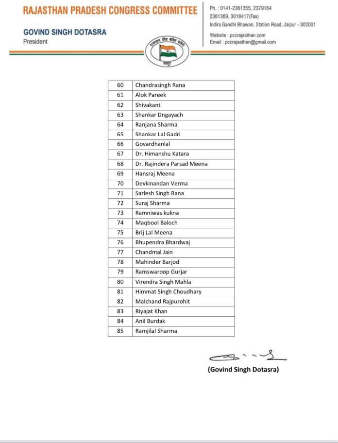 जयपुर:-कांग्रेस के प्रदेश अध्यक्ष गोविंद सिंह डोटासरा ने विधानसभा चुनाव को देखते हुए प्रभारी सुखविंदर सिंह रंधावा के अनुमति के बाद प्रदेश कांग्रेस के 85 सचिवों की सूची जारी की है । इस सूची में मुख्यमंत्री अशोक गहलोत, सचिन पायलट, डॉ. सीपी जोशी और डोटासरा के लोगों को शामिल किया गया है।