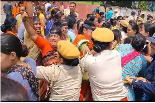 भाजपा महिला मोर्चा का थाली बजाकर प्रदर्शन में पुलिस से धक्का-मुक्की,दो महिला कार्यकर्ता बेहोश,महिलाओं ने दी गिरफ्तारी