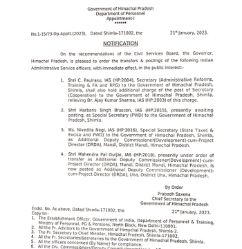 15 Feb, 2024 11 IAS अधिकारियों के तबादलेIसुषमा अरोड़ा- MD,राजस्थान सहकारिता डेयरी फेडरेशनइंद्रजीत सिंह -आयुक्त, सूचना प्रौद्योगिकी (आयुक्त हाउसिंग बोर्ड का अतिरिक्त चार्ज)शिवप्रसाद नकाते- MD,राजस्थान राज्य औद्योगिक विकासनिक्य गोहैन- संयुक्त शासन सचिव,प्रशासनिक सुधारइकबाल खान- आयुक्त,चिकित्सा शिक्षा विभागश्रुति भारद्वाज- जिला कलेक्टर डीगसंचिता विश्नोई- सचिव,राज्य निर्वाचन आयोगनारायण सिंह- प्रबंध निदेशक राजफैड,जयपुरहनुमान मल ढाका- जिला कलेक्टर दूदूशरद मेहरा- […]
