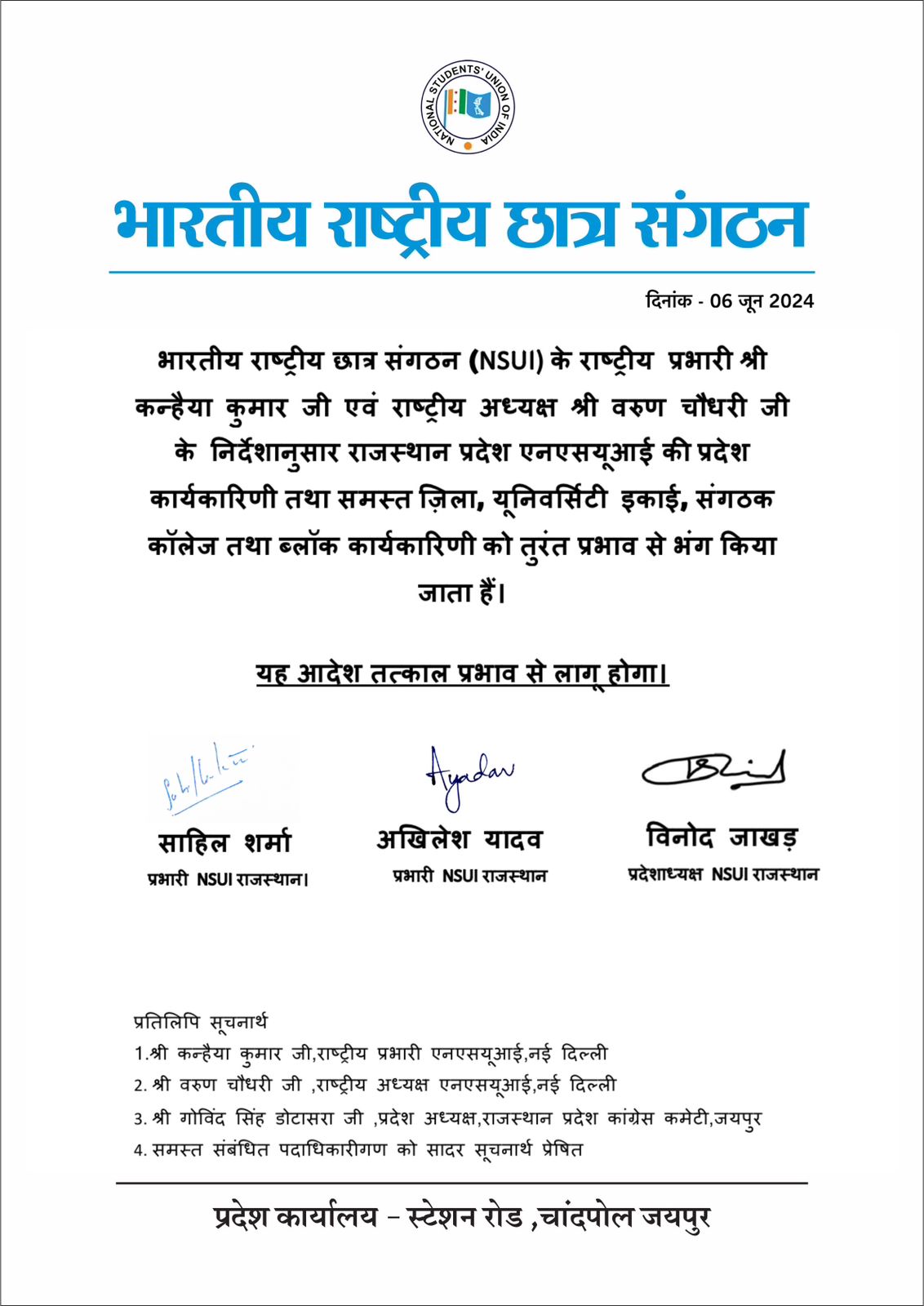 भारतीय राष्ट्रीय छात्र संगठन (NSUI) के शीर्ष नेतृत्व के निर्देशानुसार राजस्थान प्रदेश एनएसयूआई की प्रदेश कार्यकारिणी तथा समस्त ज़िला,विश्वविद्यालय इकाई,संगठक कॉलेज तथा ब्लॉक कार्यकारिणी को तुरंत प्रभाव से भंग किया जाता हैं। यह आदेश तत्काल प्रभाव से लागू होगा।