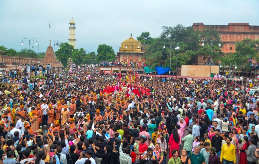 सावन की रिमझिम फुहारों के बीच तीज की सवारी पूरे हर्ष उल्लास के साथ सिटी पैलेस से निकाली गई। इस बार शोभा यात्रा में आएसी व जैल बैंड द्वारा प्रस्तुतियों से वातावरण गुंजायमान हो गया। दर्शक भी तीज की सवारी देख झूमते हुए