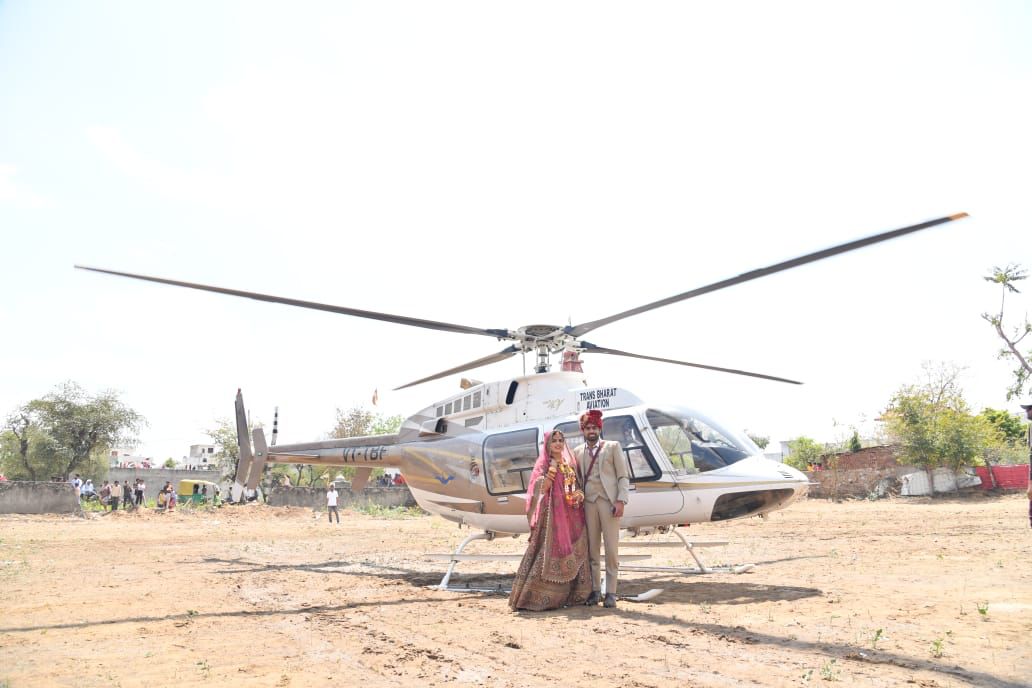 दरअसल, ये कोई फिल्मी कहानी नहीं है बल्कि गोनेर रोड निवासी शुभम की शादी की हकीकत है। शुभम के पिता शिवकुमार मीणा नगर निगम जयपुर के पूर्व पार्षद रह चुके हैं और व्यवसायी है । इनके बेटे शुभम का विवाह बस्सी तहसील के खतैपुरा निवासी बालूराम मीणा की पुत्री सुमन के साथ 30 मार्च 2023 को होना तय हुआ। बेटी बचाओ बेटी पढ़ाओ को अपने जीवन का आदर्श मानने वाले शिवकुमार का कहना है कि वे अपने घर बहू के रूप में बेटी को ले जा रहे हैं इसलिए उसका पहला कदम भी जब घर में पड़े तो उसके स्वागत में हर कोई खड़ा रहे। यही सोचकर उन्होंने बेटे शुभम से बहु को लाने के लिए हेलीकॉप्टर की बुकिंग करवाई और पिपली किशन मीणा की ढाणी में हैलीपेड भी बनवाया। इसके बाद धूमधाम से 30 मार्च को आगरा रोड जयपुर स्थित चंद्र महल गार्डन में शुभम और सुमन परिणय सूत्र में बंधे। इसके अगले दिन शुभम और सुमन सबसे पहले हेलीकॉप्टर से अपने गांव देवताओं को ढोक लगाने पहुंचे। इस दौरान आसपास के अन्य गांवों के हजारों लोग नवजोड़े को निहारने पहुंचे।