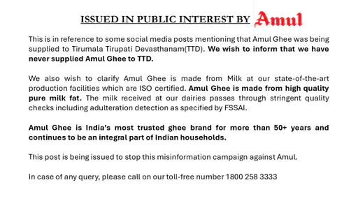 तिरुपति लड्डू में मिलावट को लेकर विवाद के बीच डेयरी कंपनी अमूल ने भी सफाई दी। कंपनी ने शुक्रवार को सोशल मीडिया पर बयान जारी कर बताया कि उसने तिरुमाला तिरुपति देवस्थानम (TTD) को कभी घी नहीं दिया।