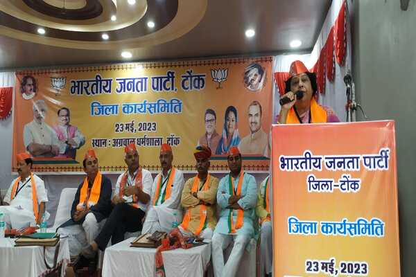 टोंक:-भाजपा जिला कार्यसमिति की बैठक मंगलवार को अग्रवाल धर्मशाला टोंक में संपन्न हुई। कार्यसमिति बैठक में मुख्य अतिथि राष्ट्रीय मंत्री डॉ.अलका सिंह गुर्जर थी तथा अध्यक्षता जिलाध्यक्ष राजेन्द्र पराणा ने की। विशिष्ट अतिथि सांसद सुखबीर सिंह जौनापुरिया,अल्पसंख्यक मोर्चा प्रदेशाध्यक्ष सादिक खान, जिला प्रभारी मुकेश पारीक थे। कार्यक्रम की शुरुआत दीप प्रज्वलन, वंदे मातरम के साथ हुई।