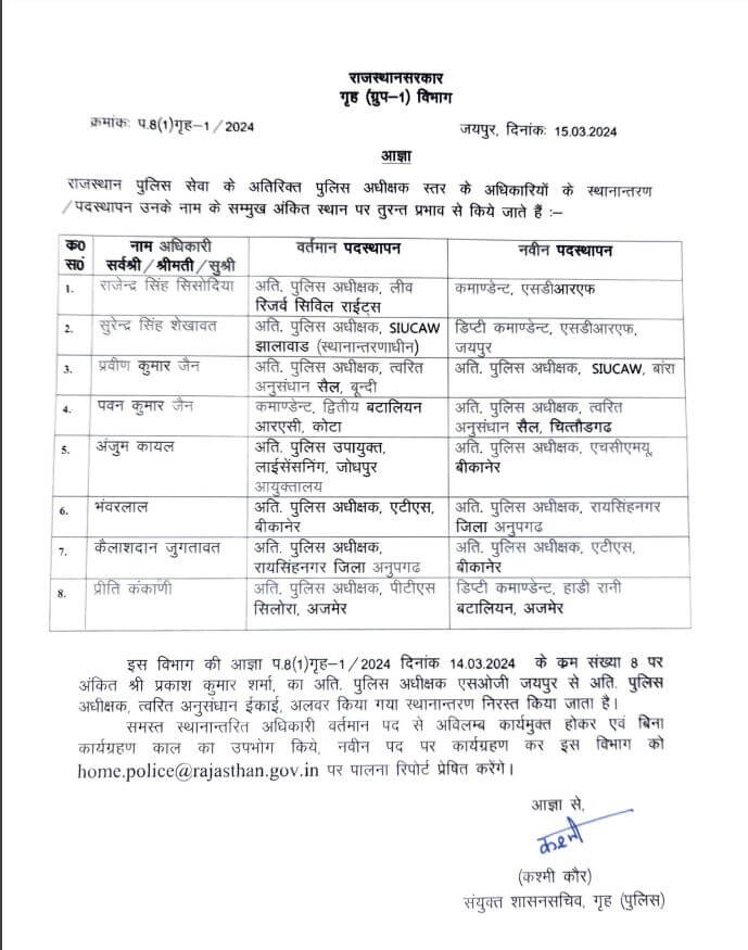 मुख्यमंत्री भजनलाल शर्मा के निर्देश पर गृह विभाग में 8 वरिष्ठ आरपीएस अधिकारियों के तबादले किए गए हैं। विस्तार से देखें सूची में नाम……