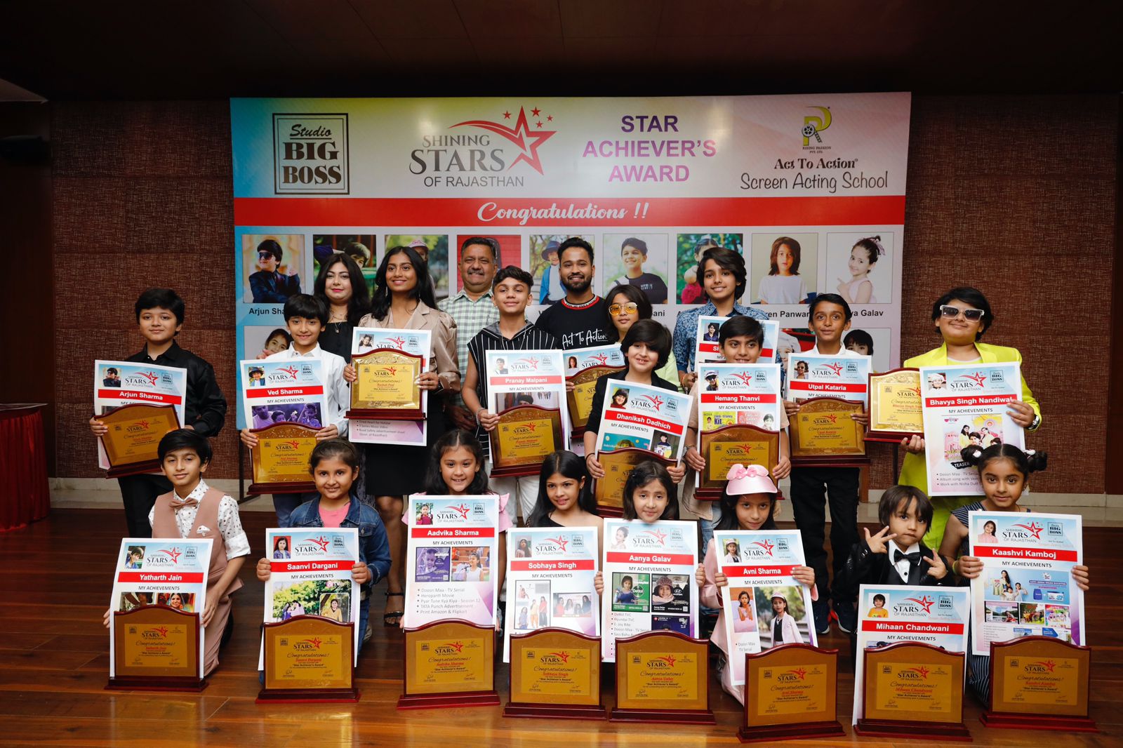 अपने टैलेंट और कॉन्फिडेंस से राजस्थान का नाम पूरी दुनिया में रोशन कर चुके नन्हें-मुन्हों के हुनर की सरहाना की गई। स्टूडियो बिग बॉस स्टार अचीवर्स अवॉर्ड का जेएलएन मार्ग स्थित रास क्लब में शनिवार को आयोजन किया गया। इस दौरान अपनी कमर्शियल एक्ट्स, टीवी सीरियल व म्यूज़िक एलबम्स में मॉडलिंग और एक्टिंग जैसे हुनर को टीवी और फिल्मों के जरिए शोकेस कर चुके 18 बच्चों को उनके उत्तीर्ण कार्यों के लिए सम्मानित किया गया। कार्यक्रम में भीलवाड़ा से धनिकष, जोधपुर से हेमांग, कोटा से आन्या गलाव, मिहान चांदवानी, बीकानेर से उत्पल कटारिया, दौसा से आद्विका शर्मा, अर्जुन शर्मा, अवनि शर्मा, यथार्थ जैन, सान्वी दरगानी, वेद शर्मा, प्रणय मालपानी, वीरेन पंवर, काशी कम्बोज, सौभाग्य सिंह, शाश्वत सिंह, रुषाली पॉल, भव्य सिंह की अचीवमेंट्स पर रौशनी डाली गई। इन सभी बच्चों ने स्टूडियो बिग बोस में पिछले कुछ सालों से होने वाले रैंप शो में भाग ले कर व एक्ट टू एक्शन, स्क्रीन एक्टिंग स्कूल द्वारा ट्रेनिंग लेकर छोटी उम्र में अपने कैरियर की नींव रखी।