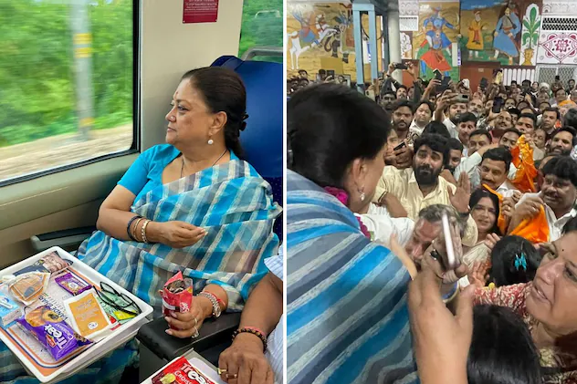 राजस्थान के पूर्व मुख्यमंत्री वसुंधरा राजे ने गुरुवार को वंदे भारत एक्सप्रेस ट्रेन के सफर का आनंद उठाया. राजे जयपुर से उदयपुर वंदे भारत ट्रेन से गईं. इस दौरान वसुंधरा राजे को देखने को लेकर स्टेशनों पर लोगों की भारी भीड़ उमड़ी. वसुंधरा की रेल यात्रा की कुछ तस्वीरें सामने आई हैं, जिसमें यह दिख रहा है कि वसुंधरा को देखने को स्टेशनों पर कैसे लोगों का हुजूम जुटा.