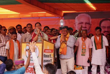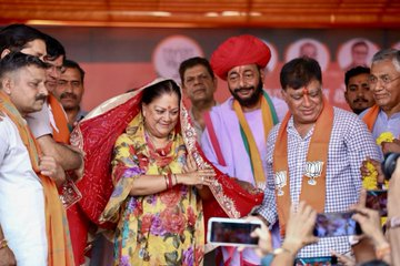 वसुंधरा राजे बोलीं-कांग्रेस सरकार जाते हुए पिटारा खोल रही:पांच साल जनता को जख्म दिए,झूठे सपने दिखाए;बाली प्रत्याशी पुष्पेंद्र सिंह के नामांकन में हुई शामिल