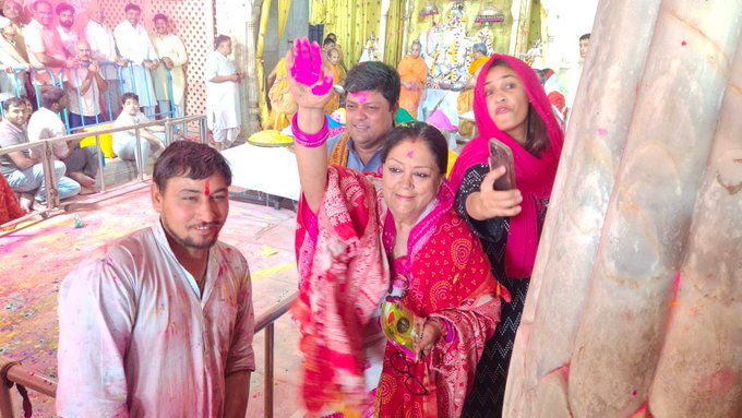 जयपुर:-पूर्व मुख्यमंत्री वसुंधरा राजे ने होली के त्योहार पर सोमवार अराध्य देव गोविंददेवजी मंदिर में भगवान गोविंद के दर्शन किए। राजभोग झांकी के समक्ष राजे मदिर परिसर पहुंची। उन्होंने भगवान के दर्शनों के बाद भक्तों पर गुलाल भी फेंकी। राजे के साथ पुत्र और सांसद दुष्यंत सिंह भी मौजूद रहे। प्रभु दर्शनों के बाद उन्होंने गोविंददेवजी मंदिर के पास स्थित गुरुद्वारा में भी मत्था टेका और प्रदेश की खुशहाली की कामना की।राजे ने कहा कि होली जयपुर का अनूठा त्योहार है, जहां भगवान के साथ हम लोगों को होली खेलने का मौका मिलता है। इस होली के रंगों में भगवान का आशीर्वाद मिलता हैं। सब तबके के लोग उसी रंग और प्यार में एक साथ भगवान के सामने नतमस्तक हैं। भगवान सबको आशीर्वाद दे। राजस्थान को सुख-समृद्धी, तरक्की और विकास के साथ भगवान से प्रार्थना है कि झोली भर-भरकर दे। इस दौरान राजे के साथ शहर भाजपा के पूर्व अध्यक्ष संजय जैन सहित कई कार्यकर्ता मौजूद रहे।