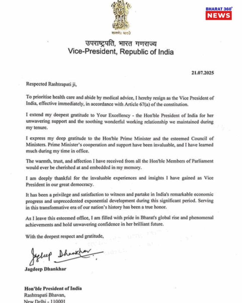 धनखड़ ने अपने इस्तीफे में लिखा, “भारत की अभूतपूर्व आर्थिक प्रगति और परिवर्तनकारी युग का साक्षी बनना मेरे लिए गर्व और सौभाग्य की बात रही है।”
